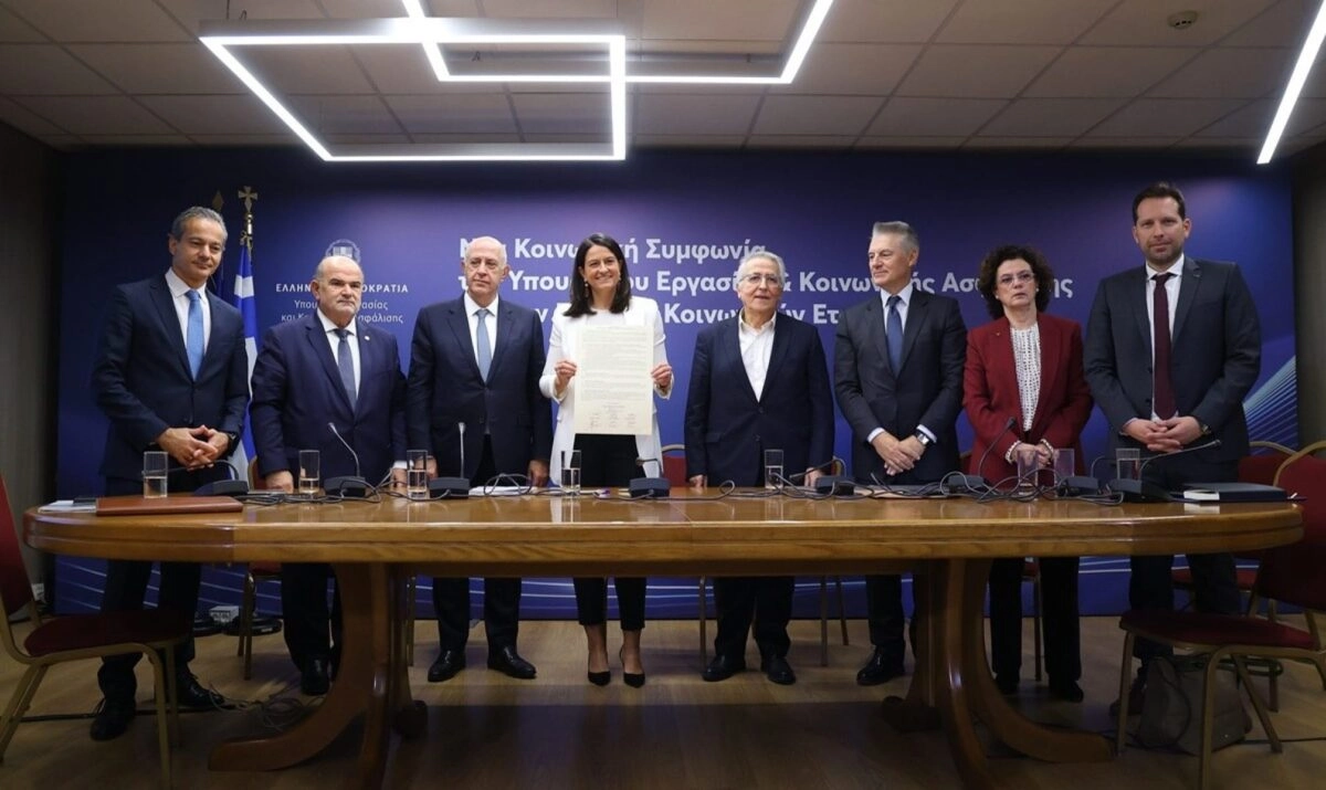 Τη συμφωνία για την ενίσχυση των Συλλογικών Συμβάσεων Εργασίας που υπεγράφη μεταξύ της κυβέρνησης και εθνικών κοινωνικών εταίρων παρουσίασε σε συνέντευξη Τύπου η υπουργός Νίκη Κεραμέως και οι εκπρόσωποι των κοινωνικών εταίρων, Γιάννης Παναγόπουλος (ΓΣΕΕ), Σπύρος Θεοδωρόπουλος (ΣΕΒ), Γιώργος Καββαθάς (ΓΣΕΒΕΕ), Σταύρος Καφούνης (ΕΣΕΕ), Γιάννης Παράσχης (ΣΕΤΕ) και Λουκία Σαράντη (ΣΒΕ).