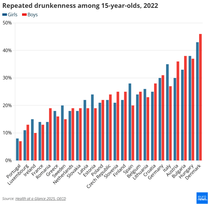 Ο αριθμός των 15χρονων που μεθούν επανειλημμένα έφτασε σε υψηλό ποσοστό άνω του 35% στη Δανία, την Ουγγαρία και τη Βουλγαρία, ενώ η Πορτογαλία κατέγραψε ποσοστό κάτω του 10%.