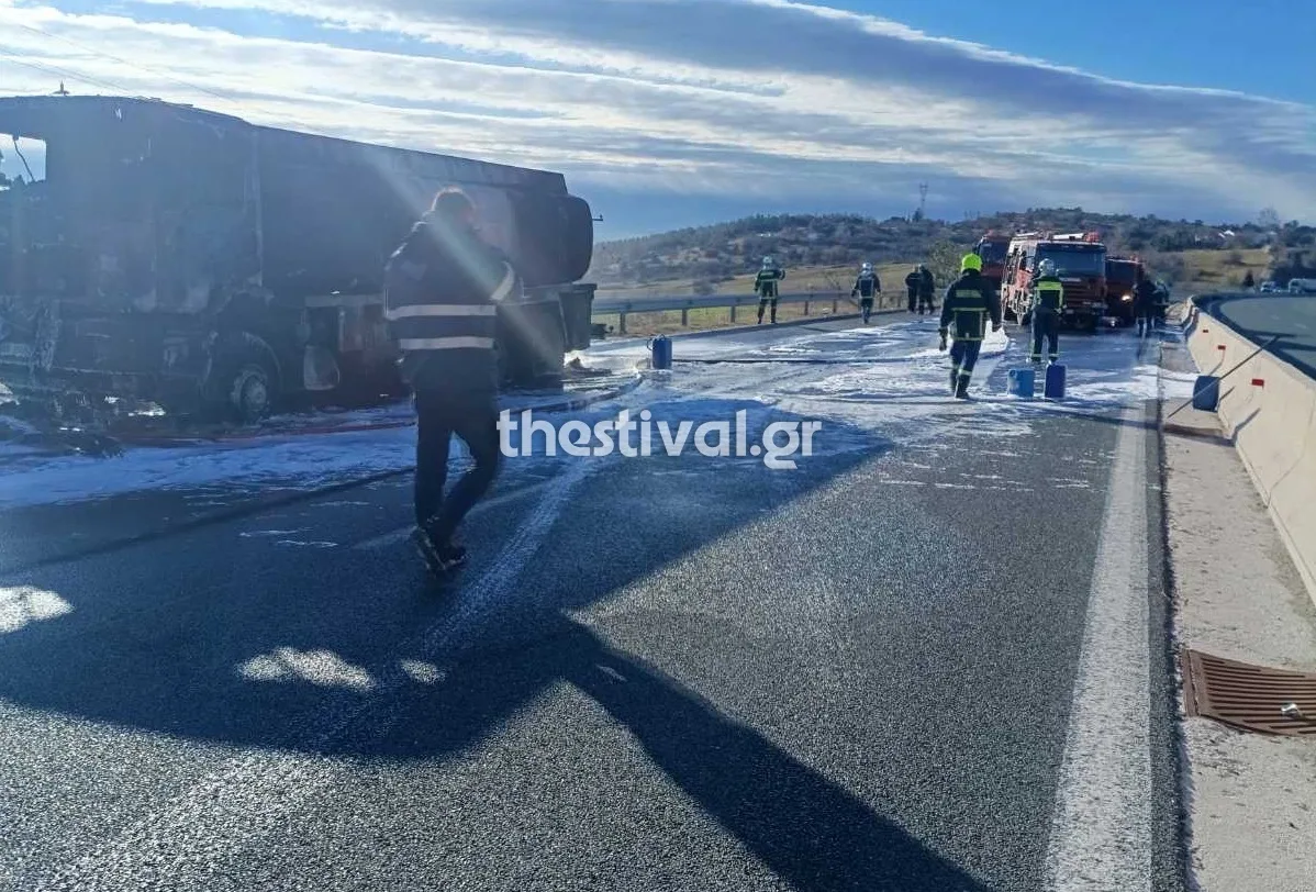 Κάηκε ολοσχερώς το βυτιοφόρο που πήρε φωτιά στην ΕΟ Θεσσαλονίκης-Σερρών έξω από τον Λαγκαδά.