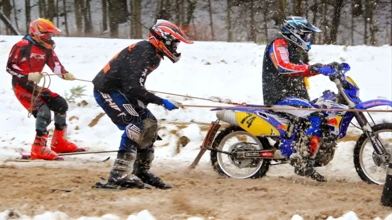 Φανταστείτε τώρα το κλασικό skijoring με σκι, χιόνι, ταχύτητα. Τώρα αντικαταστήστε τα άλογα με μοτοσικλέτες εξοπλισμένες με ελαστικά χιονιού και προσθέστε μια στενή, παγωμένη πίστα όπου ο αναβάτης και ο σκιέρ κινούνται επικίνδυνα κοντά ο ένας στον άλλο. Το αποτέλεσμα είναι χάος…