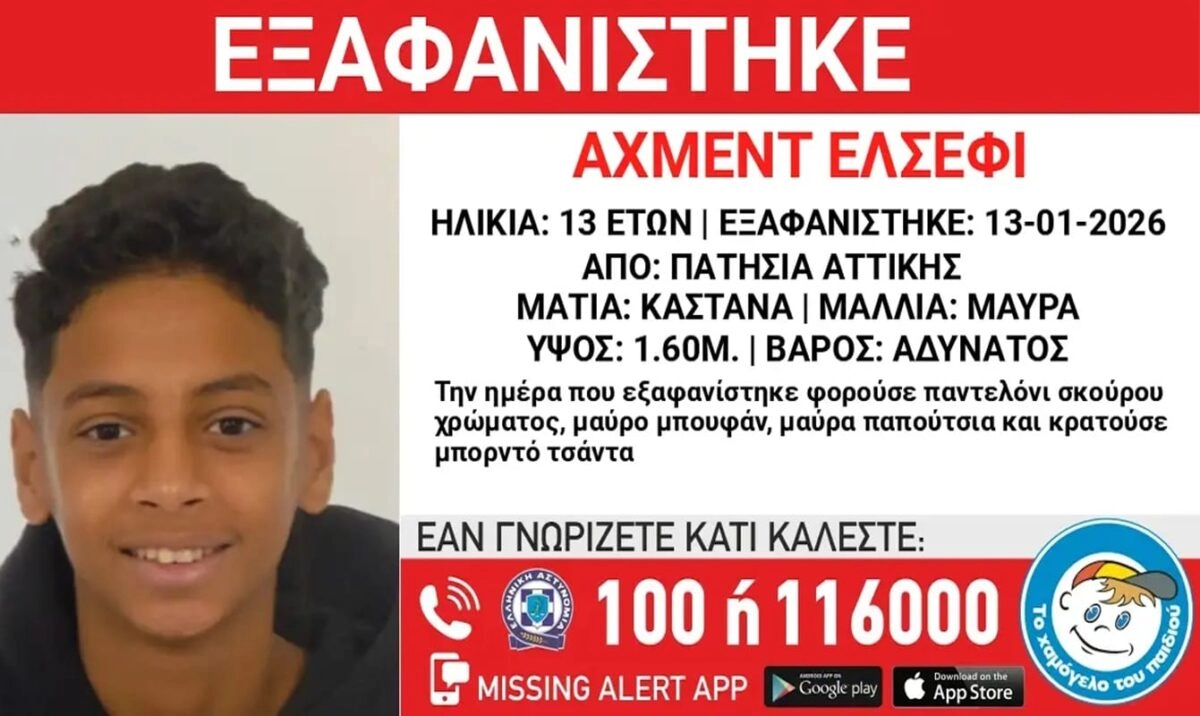 Την εξαφάνιση του Αχμέντ (ον) Ελσέφι (επ) 13 ετών, αιγυπτιακής καταγωγής, γνωστοποιεί το «Χαμόγελο του Παιδιού» με ανακοίνωσή του την Τετάρτη (14.01.2026).