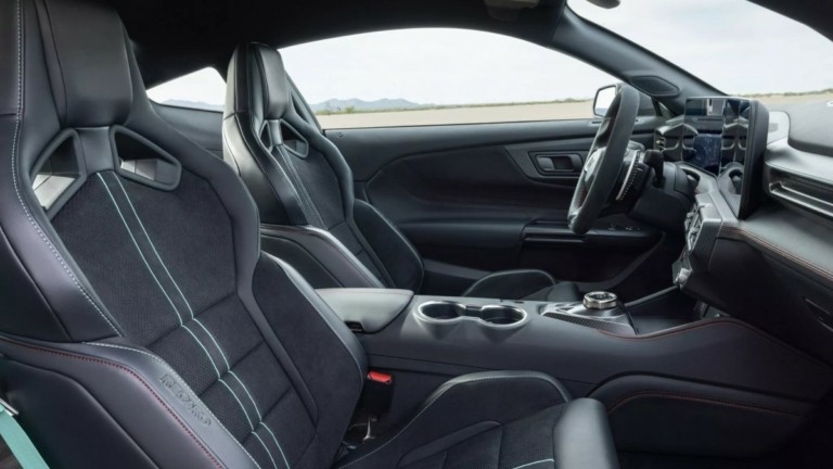 Στο εσωτερικό, η Mustang Dark Horse SC παίρνει στοιχεία κατευθείαν από την GTD. Το flat-bottom δερμάτινο τιμόνι είναι το ίδιο, ενώ alcantara και ανθρακονήματα κυριαρχούν.
