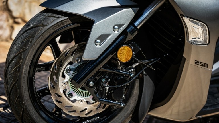 Τα φρένα είναι πολύ ισχυρά με δίσκο 260 χιλ. εμπρός και 4πίστονη ακτινική δαγκάνα και έναν δίσκο 240 χιλ. πίσω με δικάναλο ABS. Το σύστημα πέδησης έχει άφθονη δύναμη και πολύ καλή αίσθηση, ανάμεσα στα κορυφαία της κατηγορίας με άνεση. Οι τροχοί από την άλλη είναι 14 ιντσών εμπρός και 13 ιντσών πίσω.