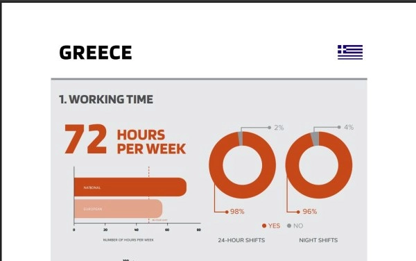Το 88% κάνουν υπερωρίες, από τις οποίες τα δύο τρίτα δεν αποζημιώνονται. Σχεδόν τρεις στους τέσσερις κάνουν νυχτερινές βάρδιες, ενώ το 62% εργάζεται σε 24ωρες βάρδιες.