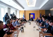 Ολοκληρώθηκε η συνάντηση κυβερνητικών στελεχών με εκπροσώπους των αγροκτηνοτρόφων, η οποία πραγματοποιήθηκε στην αντιπροεδρία της κυβέρνησης, στο Μποδοσάκειο Ίδρυμα.